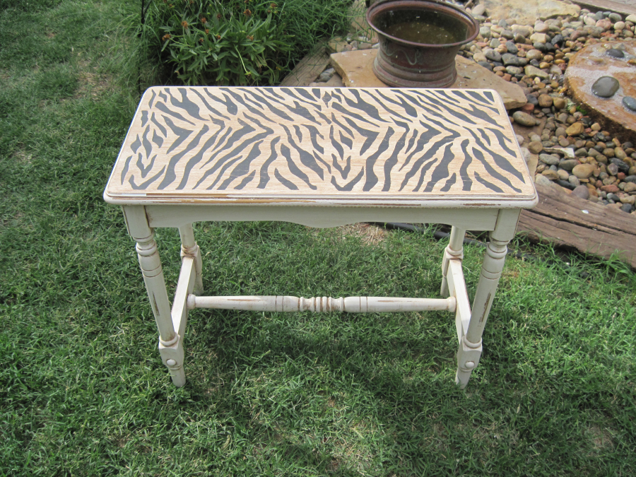 This small bench was found in a local alley for destruction. I couldn't stand to see her go away. I used an antique white satin and stencilled the zebra stripes. I followed up with a umber brown stain. I sealed this project with Minwax hand-rubbed poly. She is now gracing our bathroom!