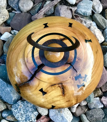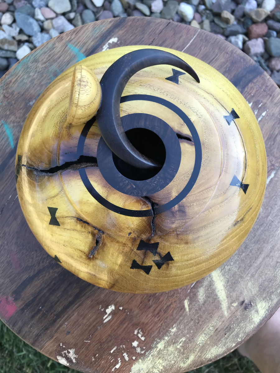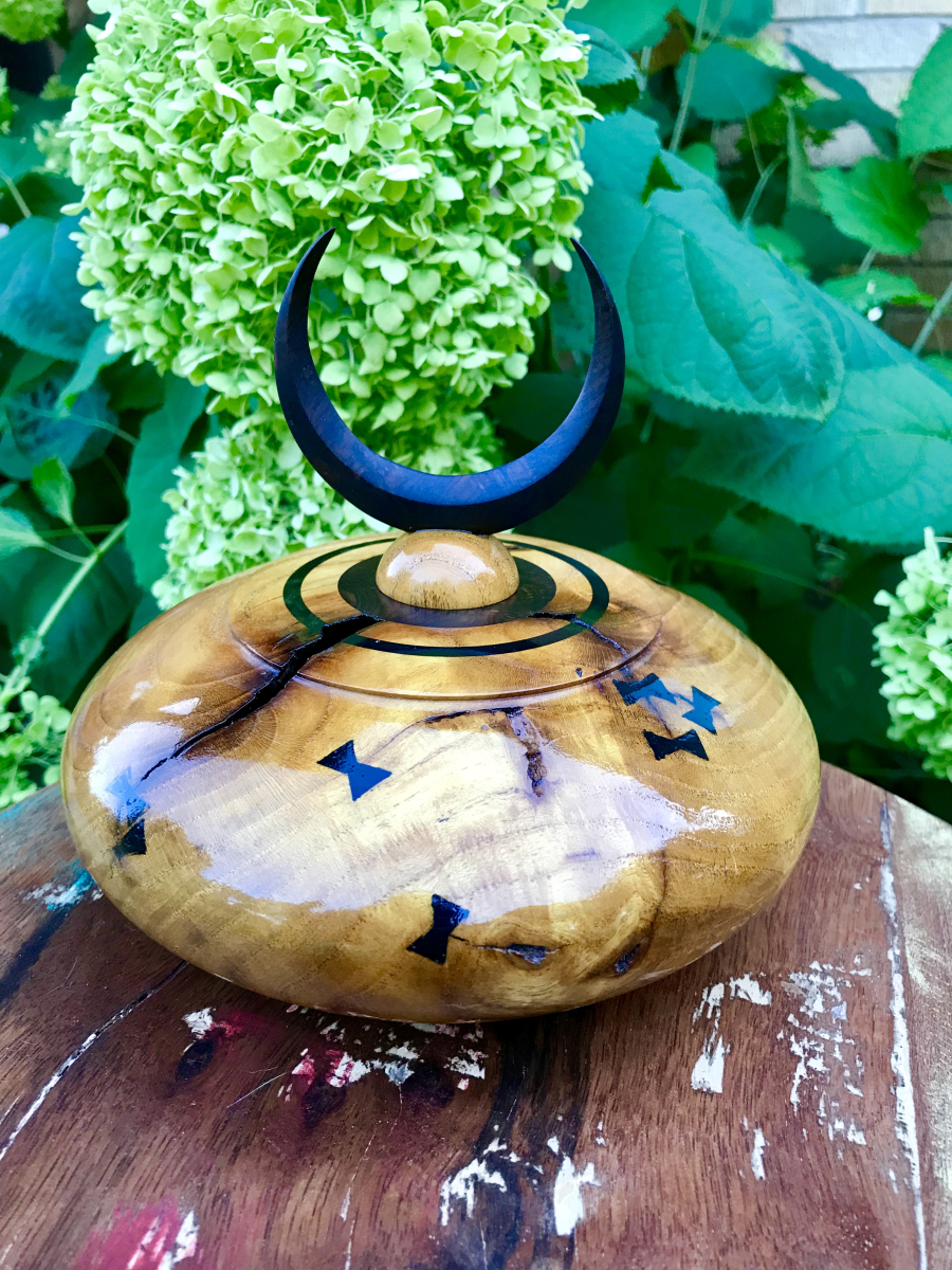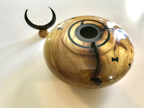 “Scarab” is an Egyptian inspired mulberry hollow form with African Blackwood accents and multi-axis turned finial. The bow ties are inlayed charcoal and epoxy to serve as both aesthetic and structural purposes. Multiple applications of tung oil bring depth and brightness to this piece, combined with a Renaissance wax top coat to create a rich depth with a protective finish. At 6 and 1/2 inches wide by 5 and 3/4 inches tall, this unique piece brings all eyes to its attention.