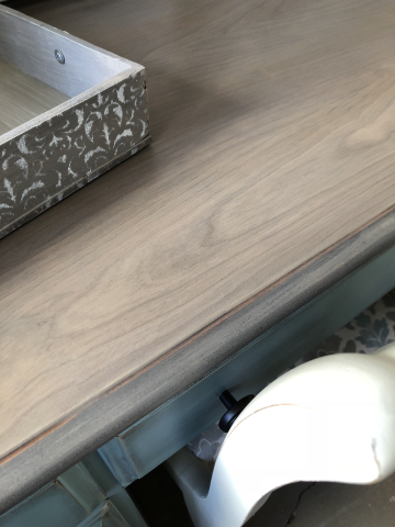 The body was painted in Persian Blue and glazed with taupe paint. Top was sanded down to the bare wood and was given a taupe paint wash.