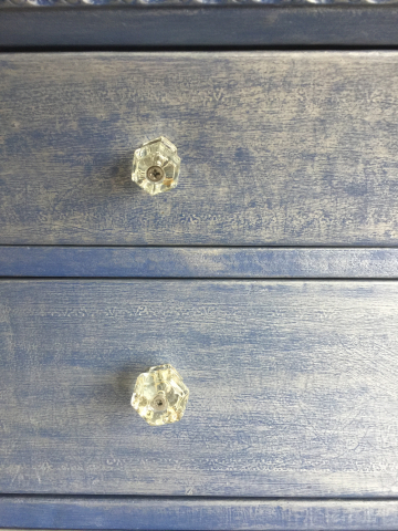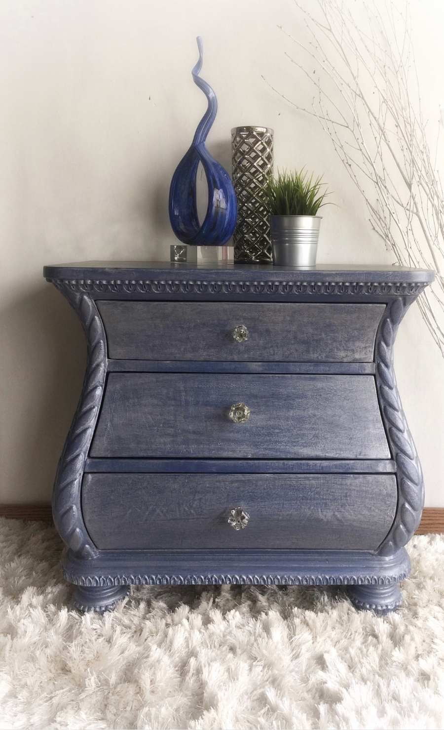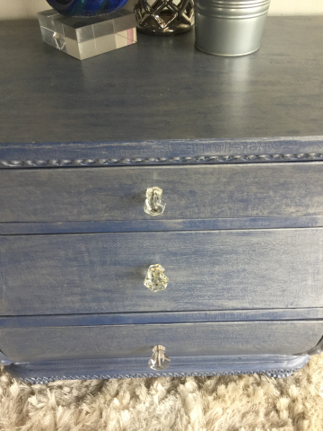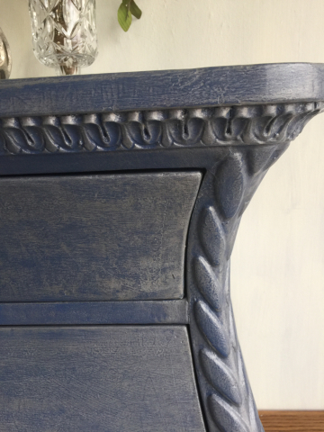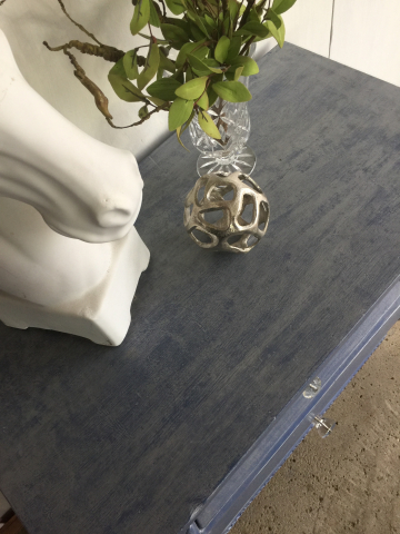 This stunning Bombay Chest was screaming for a makeover.  Base coat is two coats of GF Klein Blue than I took  Argentina Pearl Effect and brushed it on and took  aluminum foil and pressed it into the pearl effects till it gave a perfect silver patina with just enough Klein blue showing.