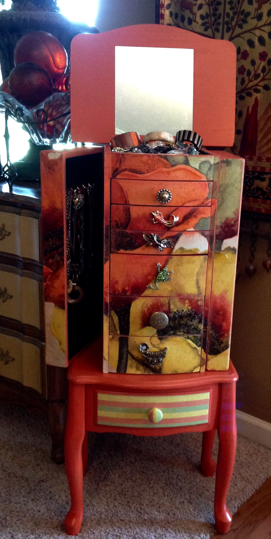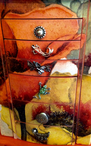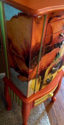 Hot summertime colors,over the top custom knobs make up this yummmmmmy!!! Concoction. Decoupaged canvas...custom tissue paper and knobs. Beware this is not for every one ...you gotta be as strong as this piece to use it but was listed for about five minutes.