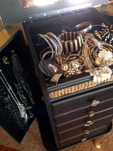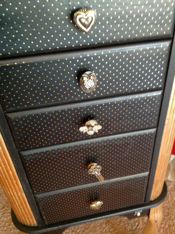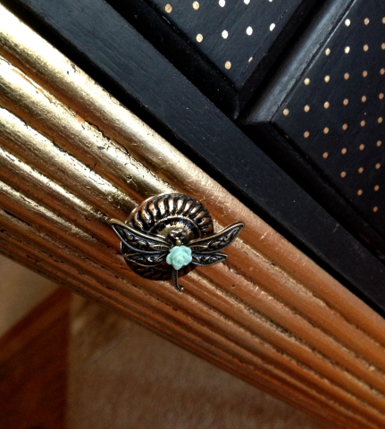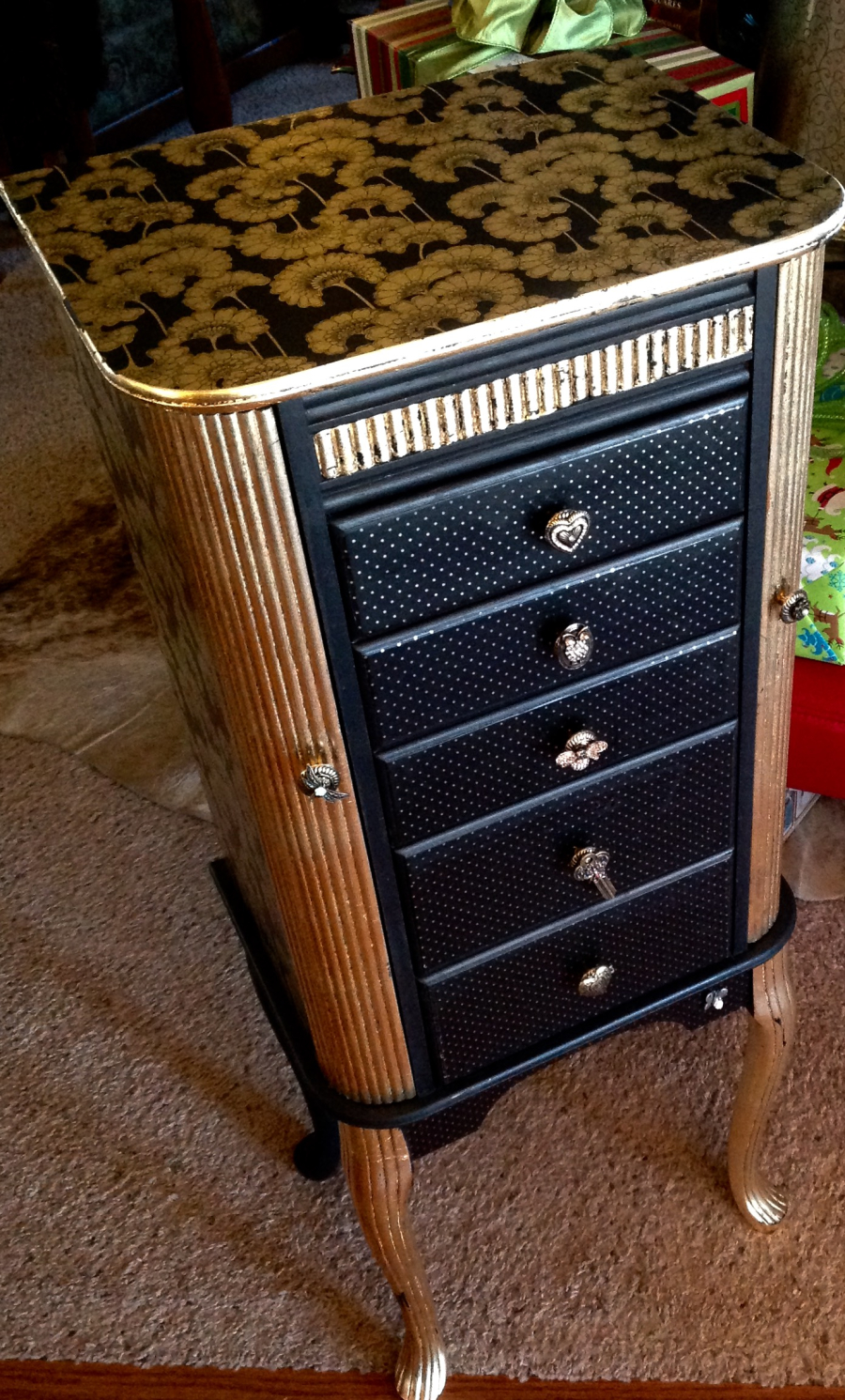 Painted black decoupaged with glitzy wrapping paper and gold leaf details. No, you can't substitute gold Rub and Buff for the leaf it is just not the same ....try it it is very easy. This super star got custom made knobs for all the drawers and then it was ready for a very happy client
