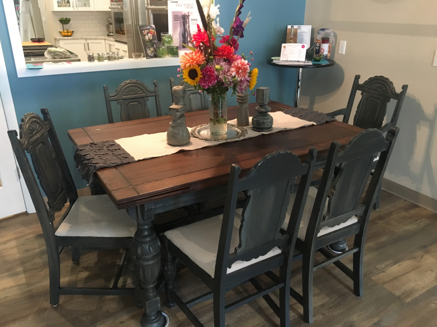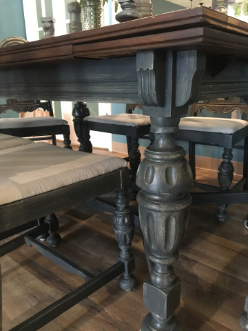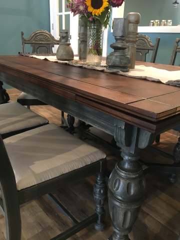 A fellow business owner needed a dining table and chair set in a short amount of time to host a dinner party at her cook supply store...I felt so honored that she asked me to refinish one for her.  Quickly brushing and layering 3 different colored chalk style paints by General Finishes leads to a fun look.  The top was sanded to bare wood and stained with antique gel stain.