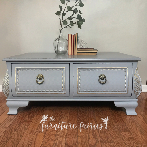 The coffee table boasts 2 large deep felt lined drawers as do the matching end tables. This set has a layered paint effect and touches of gold gilding on all the details.
