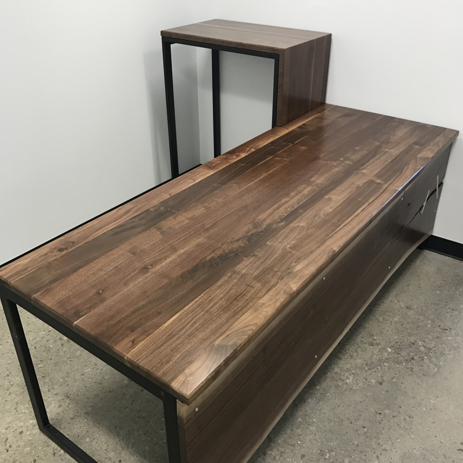 Rich walnut waterfall desk top that flows with grain wrapping down to another larger desk top. Black powder coated perimeter frame chassis with a lively walnut slab apron front. High contrasting maple ties mortised in for structural needs as well as an asthetic bonus.