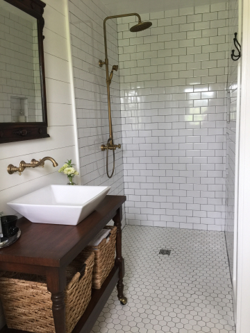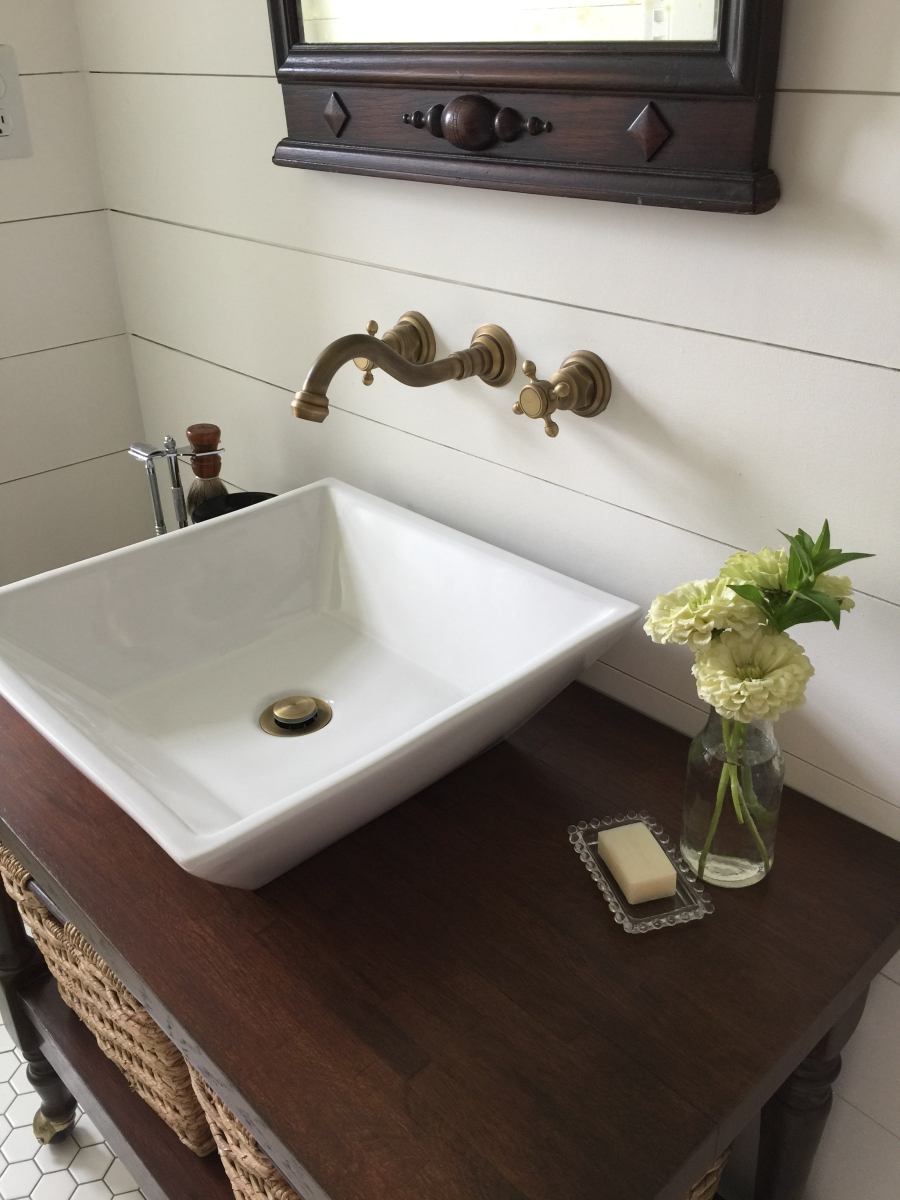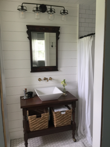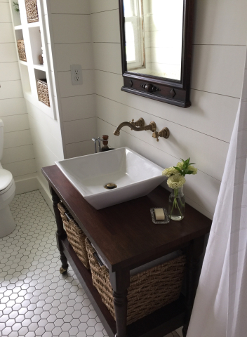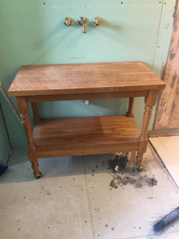 We did a bathroom remodel for our very tiny master bathroom. We needed a small vanity. We had my husbands parents old microwave cart just sitting in the garage and realized it was the perfect size but hated the yellow oak. I decided to give the General Finish Gel stain a try. It was my first time ever using it and I couldn’t believe how easy it was! I sanded the top down to the raw wood but wasn’t able to get the legs completely sanded down so I was concerned it would be splotchy. It turned out even better than I had imagined! I’m absolutely in love with the product and now want to gel stain all the wood in my house.