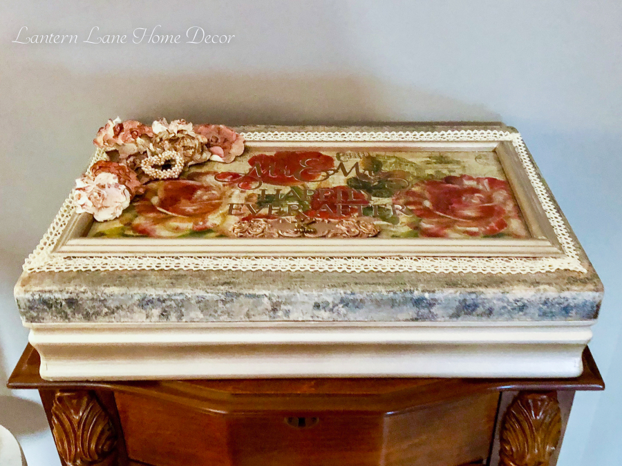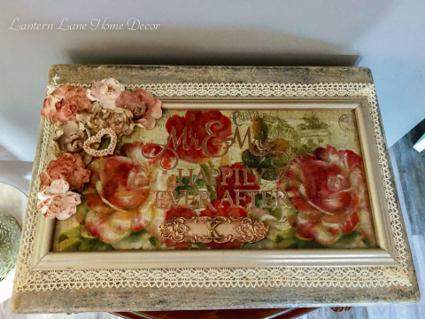 One of a kind! This keepsake box began it's life as an old silverware box. The silverware long gone, it needed a new purpose. The nuptials of a friend provided the perfect opportunity to creat a one of a kind gift. The box was given a coat of primer then the magic began. The box bottom was sprayed with Champagne Mist. The top of the box underwent a process blending and blotting different colors of paint to create a dimensional finish. Next came the application of a flowered napkin via Modgepoge. A spray of clear coat was applied after the napkin had dried. Wood trim was sprayed with the same Champagne Mist color and applied to create a frame around the napkin. Lace ribbon softened the look.Then came the embellishments! Searching for just the right color combination, simple white paper flowers were sprayed with various shades of rose and pink paints heavily watered down. Once dried the tips were hand painted with gold metallic paint. Vinyl letters were sprayed in a Rose Gold for a subtle effect. A resin mold sprayed in Rose Gold was applied and created the perfect frame for the pendant jewel. The pearled heart was the final piece to complete the look.