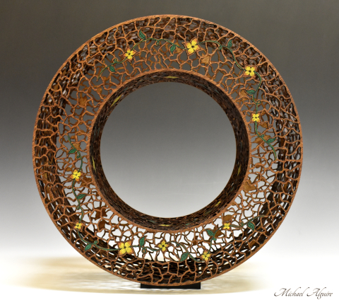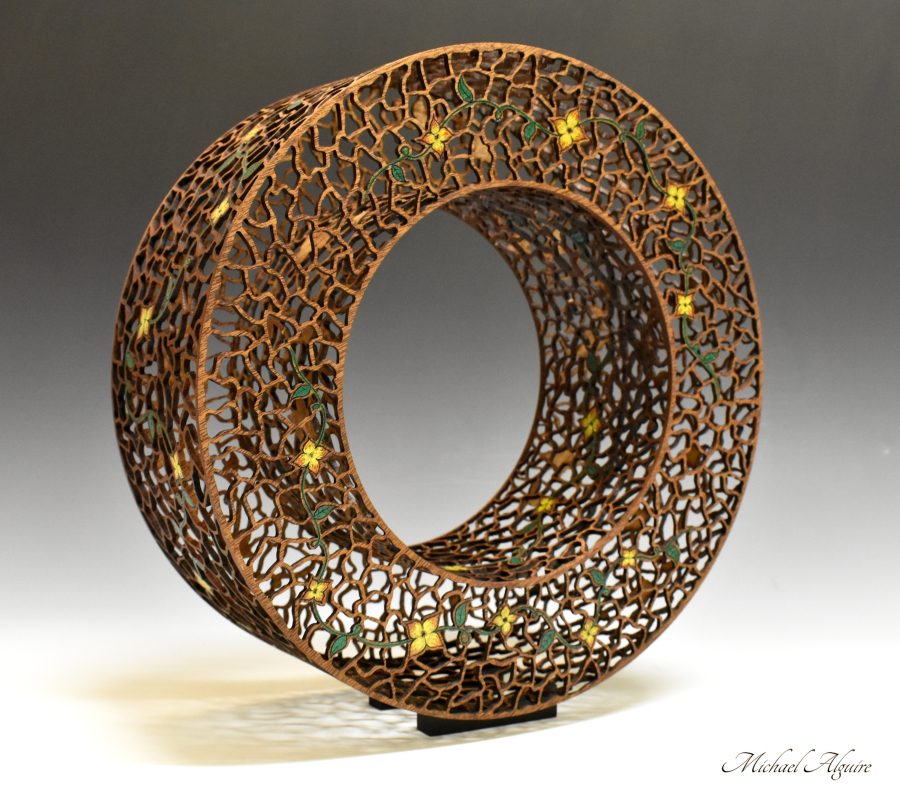 Wheel of Delicacy #4 Mahogany Garden This is my fourth one in my series and i think they are evolving nicely. Honduran mahogany Many hours went into this piece with the turning ,piercing ,the burning , and the coloring. I had also made a extension for a tiny burr that i could use to reach inside the piece to allow me to clean up some of the glue that drip on the joint , it worked like a charm but a bit stressful reaching through the webbing of the piercing , thankfully it all went ok and me and the piece survived. Honduran Mahogany tung oil , piercing wood burning , acryllic paints and faber castel ink for the embellishments. 10" in diameter with a 5.750" inside diameter and 3.750" wide.