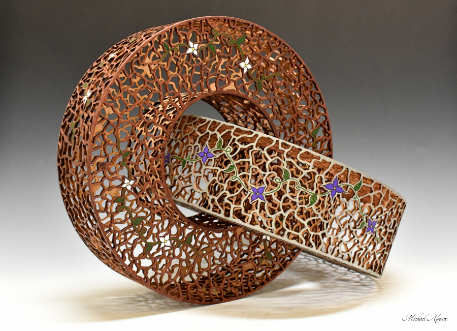 This is the latest in my series of wheels, i wanted to push the boundaries a little and take my wheels a step further. This one was tons of work and I'm glad to be done and start on another. The wood is kiln dried cherry for both wheels the silver wheel was painted with general finishes Argentine pearl ,and the other was stained with Georgian cherry gel stain , the design was then burned on both wheels and then i did the piercing , and last was coloring the flowers. The paint for the flowers was water based. Both wheels measure 11.250" in diameter. And have an inside diameter of 5 " and they are 3.500" wide. Many many hours were involved so im hoping everyone enjoys it just as much as me.