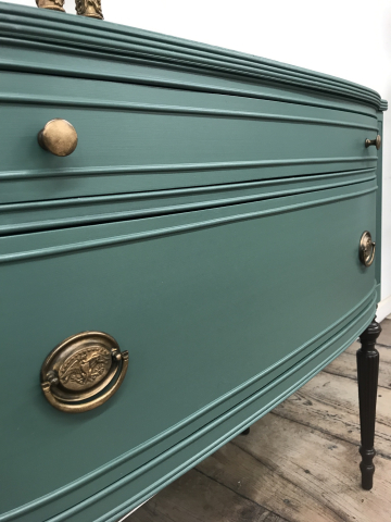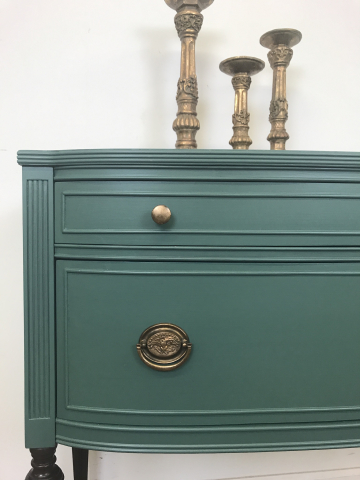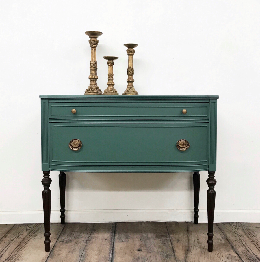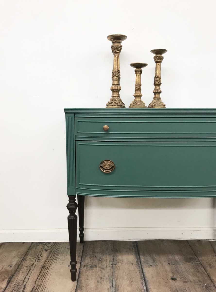 Hello gorgeous!  This petite vintage sideboard was adorned with a custom Emerald Green and beautiful Java legs. Â