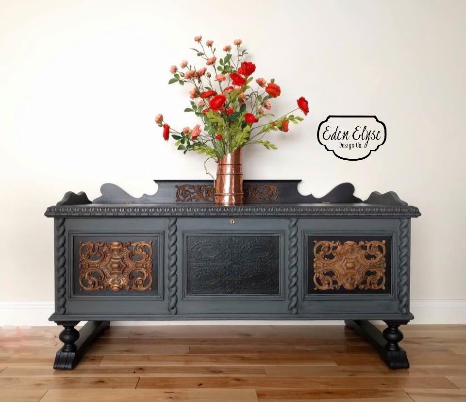 This chest has been in my family for three generations and was built to stand the test of time. I refinished the exterior in lamp black milk paint and a deep blue with a black glaze that has brought new life and a refreshed style.  I have left some of the decorative molded pieces in natural wood, adding a nice contrast to the black paint. The cedar interior remains unfinished and has that unmistakable fresh cedar fragrance.