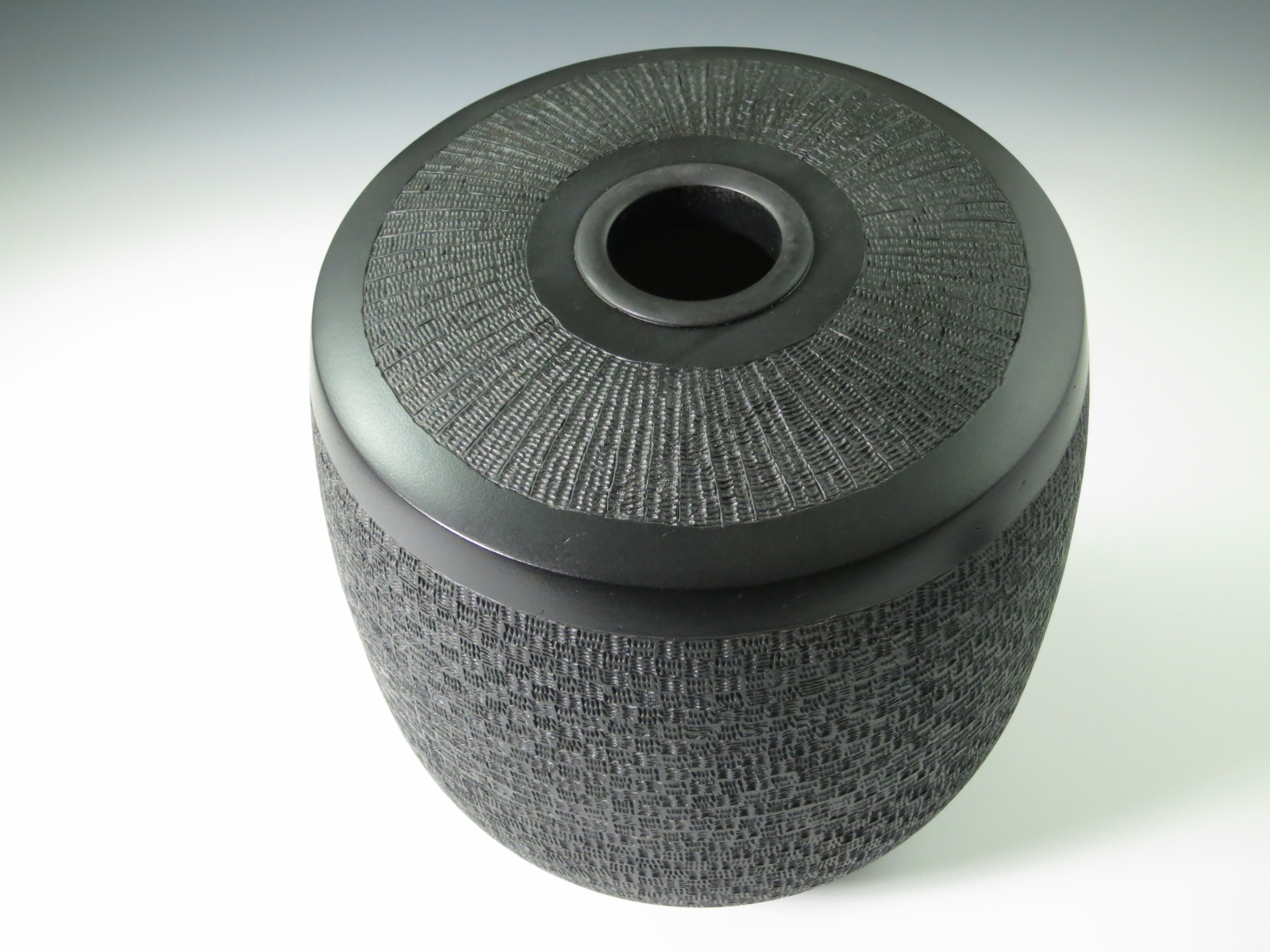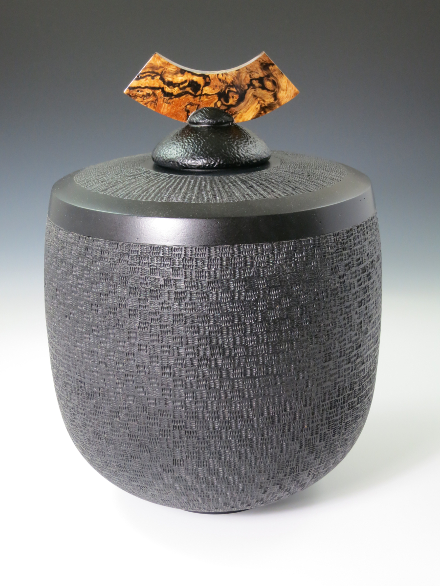 I have taken a log section of Florida Cherry and turned and hollowed a vessel that is about 11" tall and 8" wide. I applied a basketweave texture to the exterior with pyrography(Woodburning), I also added additional texture with a power carver. I then took a slice of Live Oak Burl and made a lid. the exterior and lid were ebonized and the exterior was given a finish with Gel Topcoat.