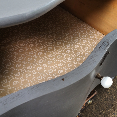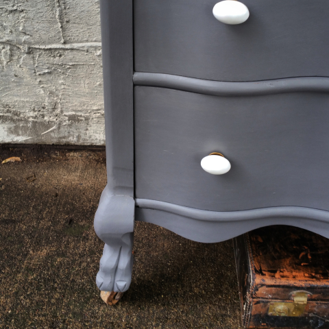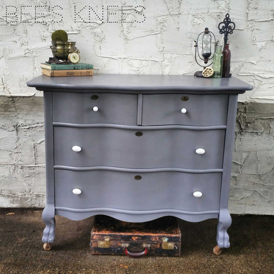 Dresser painted with General Finishes Milk Paint in Driftwood. Features updated hardware and lined drawers.