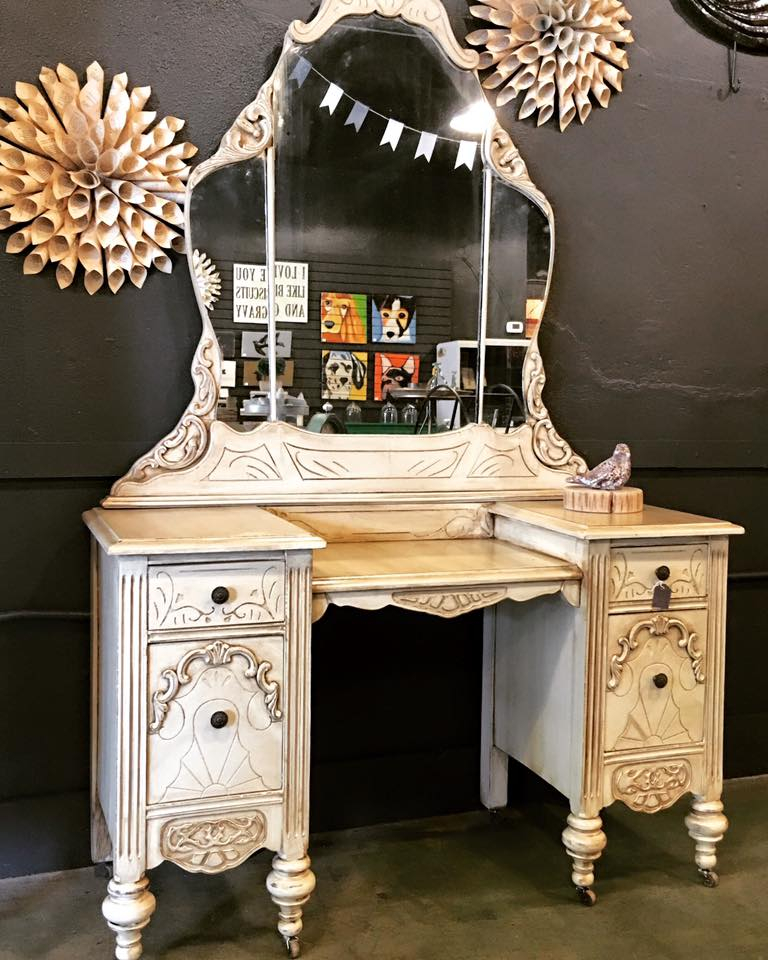 This vintage vanity was a barn find and destined for the fire pit, but I rescued it before that could happen. All the drawers were stuck in place and literally had to slowly and carefully disassemble the vaninty to dislodge the drawers. After reassembly, the entire vanity, mirror frame and supports were sanded to remove all original finish. The drawers, side panels, lower part of the mirror support, and upper part of mirror frame I hand applied 3 coats of New Pine Gel Stain. For the body frame, top, mirror and mirror supports I hand applied 2 coats of Georgian Cherry Gel Stain, and then 2 coats of Black Gel Stain over that and lightly distressing so that the Georgian Cherry color in areas would show through. I applied 3 coats of High Performance Top Coat - Satin (Sprayed) over the entire vanity. The hardware was sprayed in a black lacquer finish.