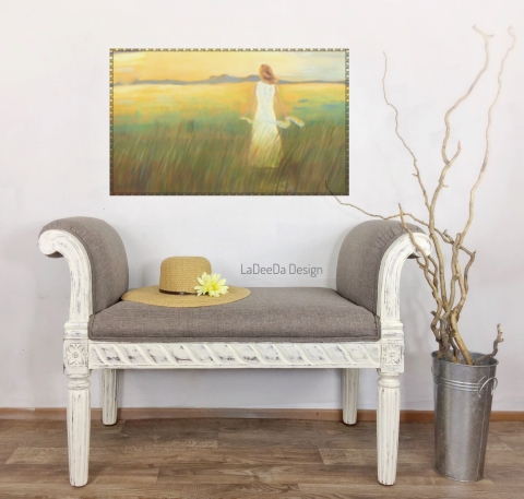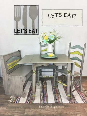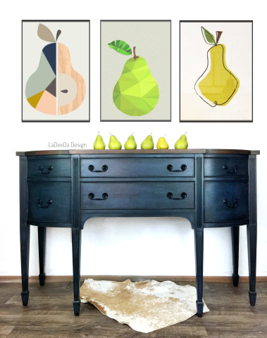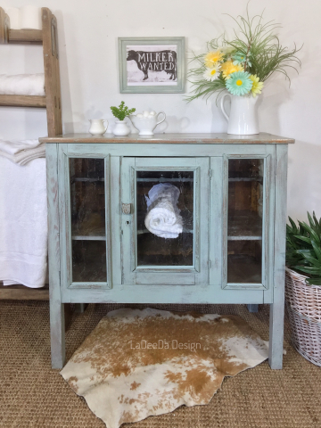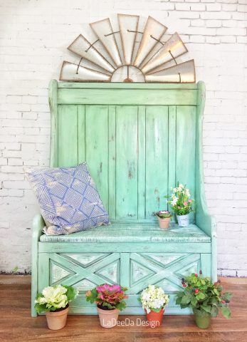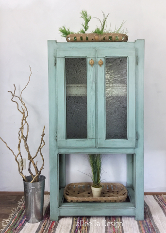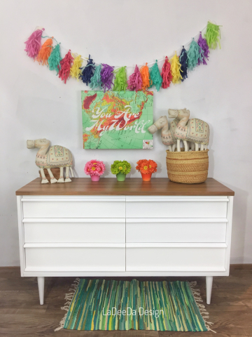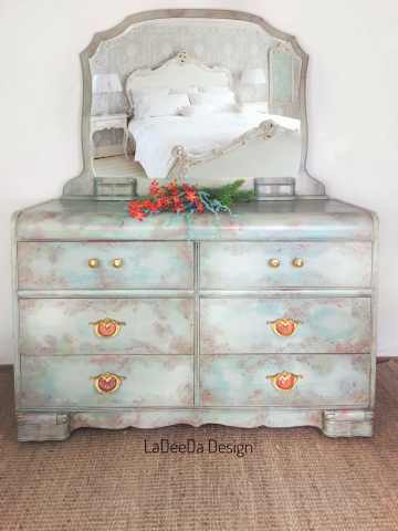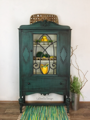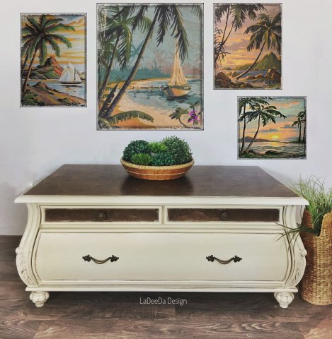I began by painting a base coat of teal. I sealed the teal. I then randomly painted the variety of Pearl Effects colors all over the chest. As I feed a color I misted it. When everything was dry I sealed the chest. Lastlly, I placed an oval copper tray filled with succulents in the drawer cubby.