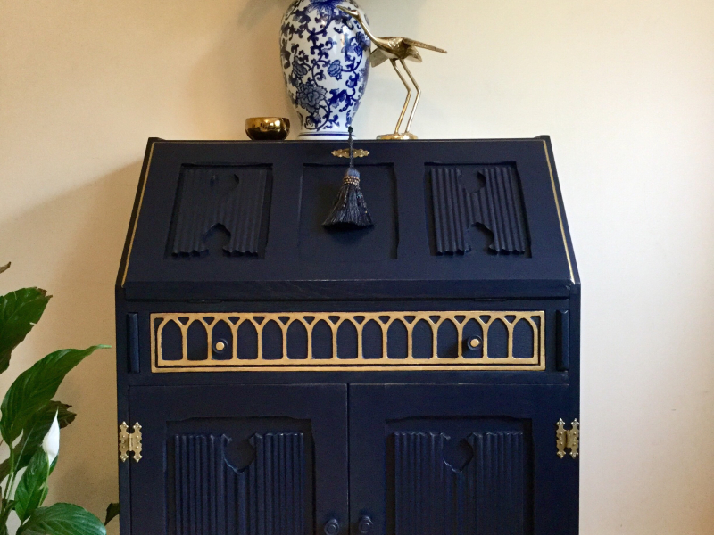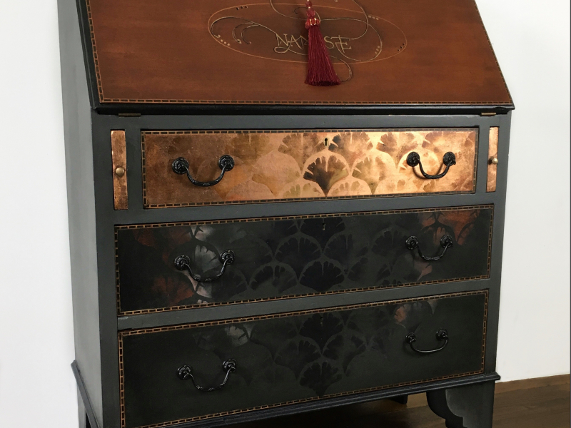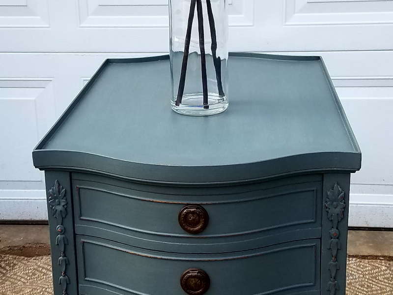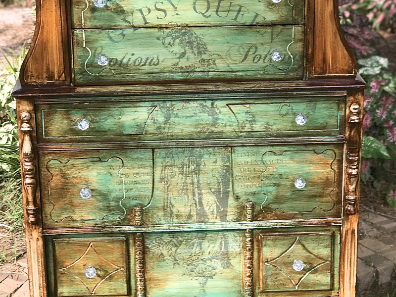 This beauty was painted with General Finishes Patina green, lightly distressed, Dark waxed and Glazed with General Finishes Tawny Pearl effects.