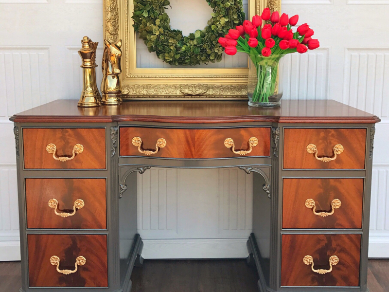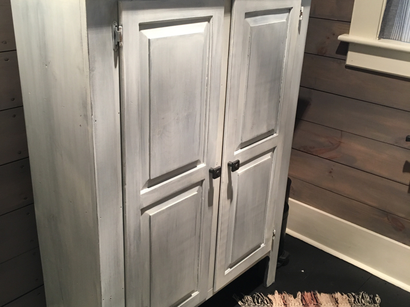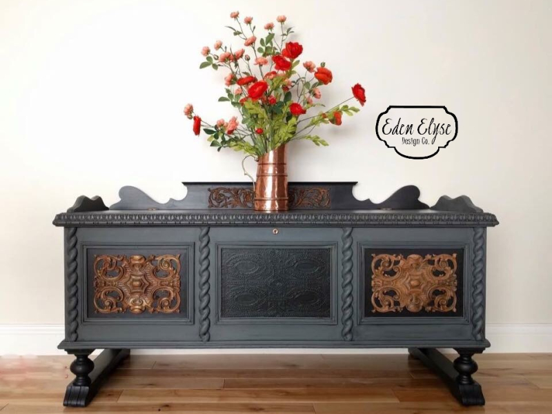 Painted in a custom mixed color of Queenstown Gray and Lamp Black. The wood areas are stained with Java Gel and whole body sealed with HPTC Satin. I gave this piece a medium distress in all the right spots!