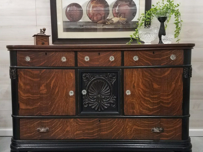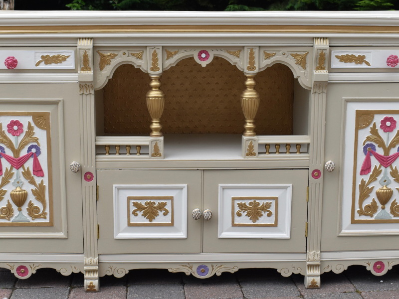 This Beauty was a Beast, a solid antique one piece china hutch finished in GF Lamp Black. Her stunning beauty was enhanced throughout in an antique gold. She includes all her original hardware and a beautifully stenciled backboard. She's got great storage space with 3 drawers lined in a printed burlap fabric and 2 cupboards painted in a two-tone of red and Lamp Black to match the backboard.