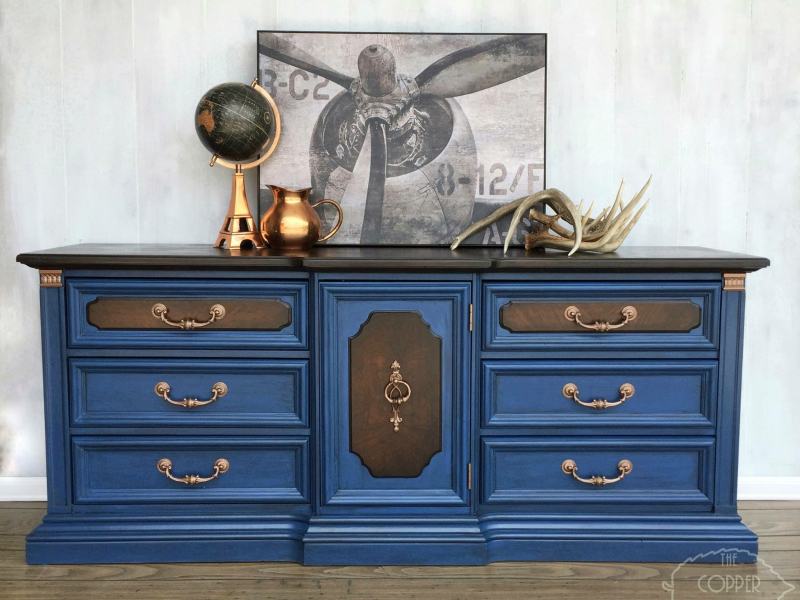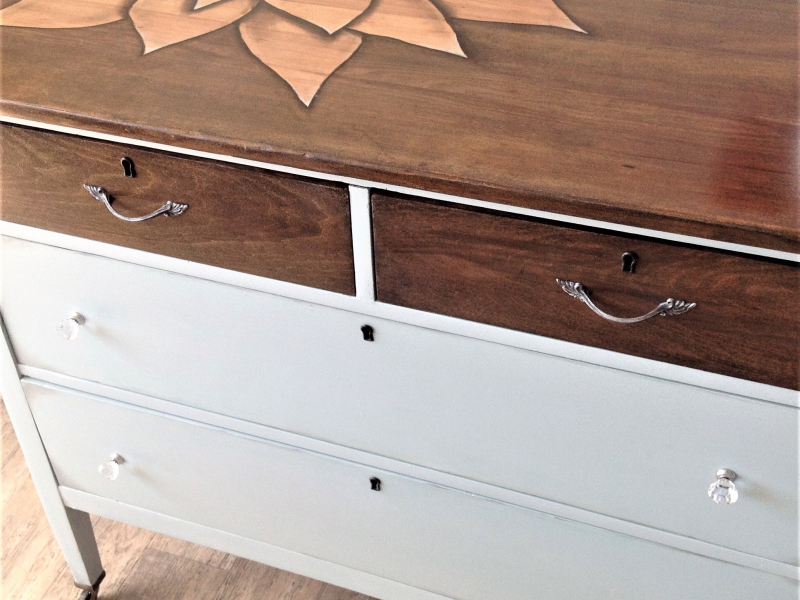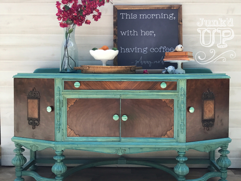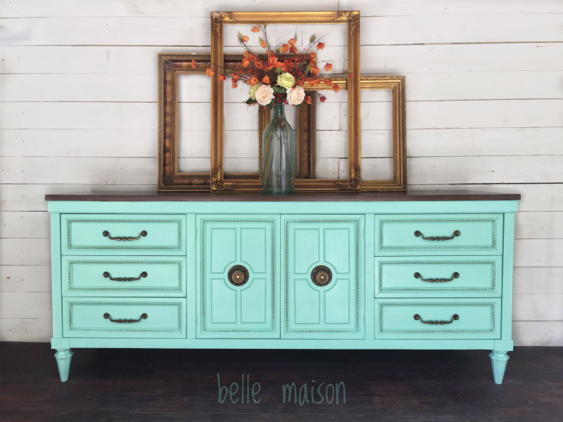 The dresser was painted using a custom blend of 1 part Patina Green, 2 parts Emerald, 2 parts Coastal Blue and 1 part Corinth Blue Milk Paints which created a wonderful peacock...