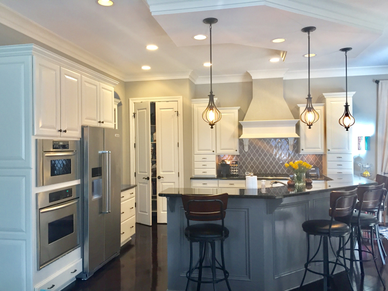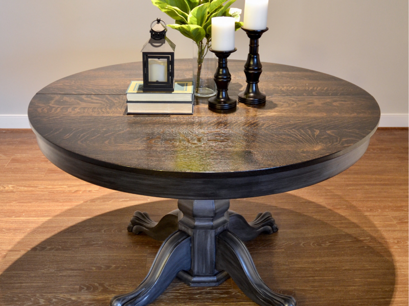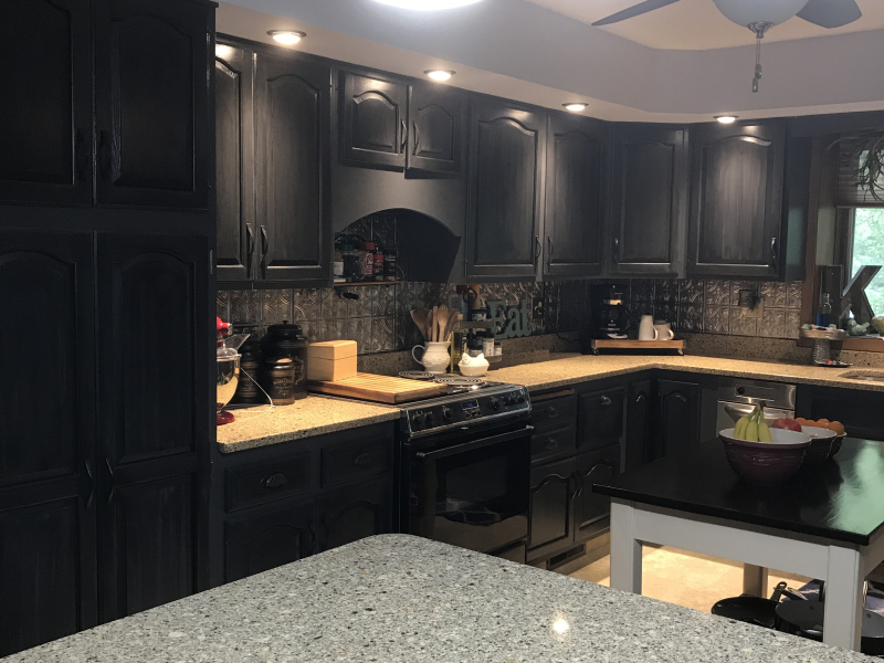 Refinished from dark stain to grey with black glaze. I used General Finishes Stain Blocker on the island to prevent bleed through from the previous finish - a very red stain!