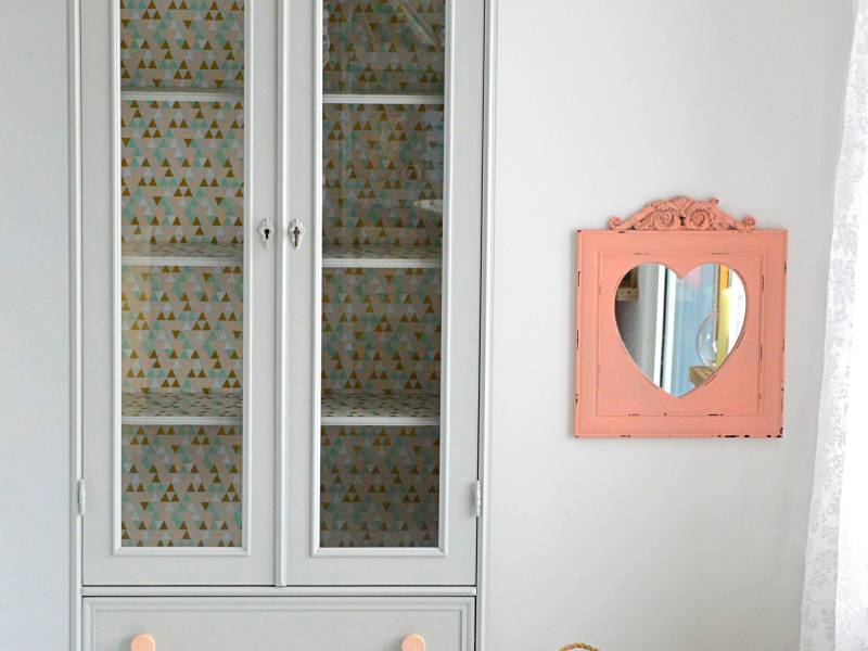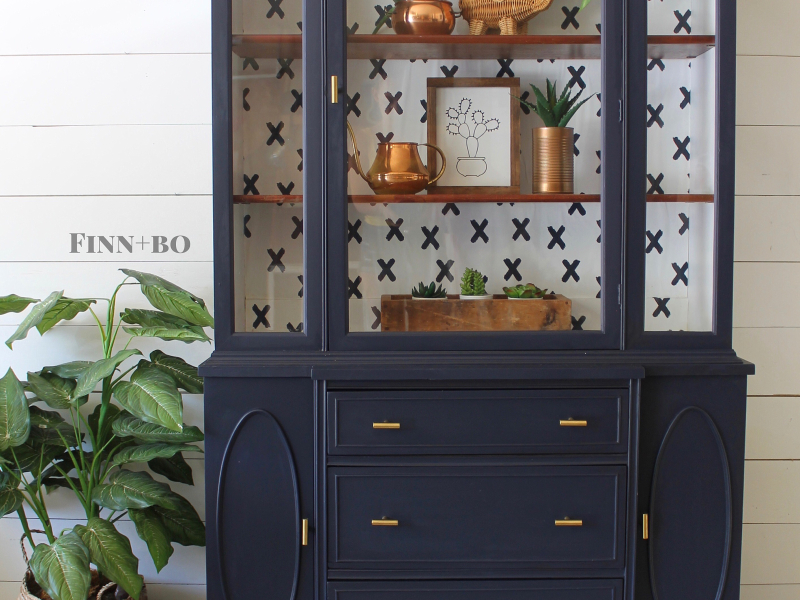 I really wanted this china cabinet to have a wow factor, and to make it more modern. The coastal blue milk paint is one of my favorite colors, and paired with the paper backing, it really upped it's game!