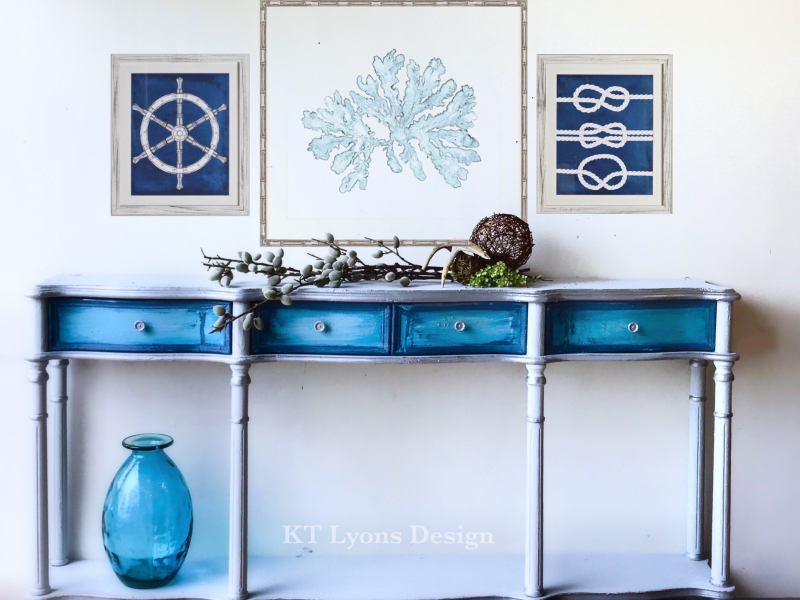 After coming home from a trip to the beach, I was inspired to blend up a batch of General Finishes milk paints using all the wonderful blues and greens! This piece was finished completely with General Finishes products.